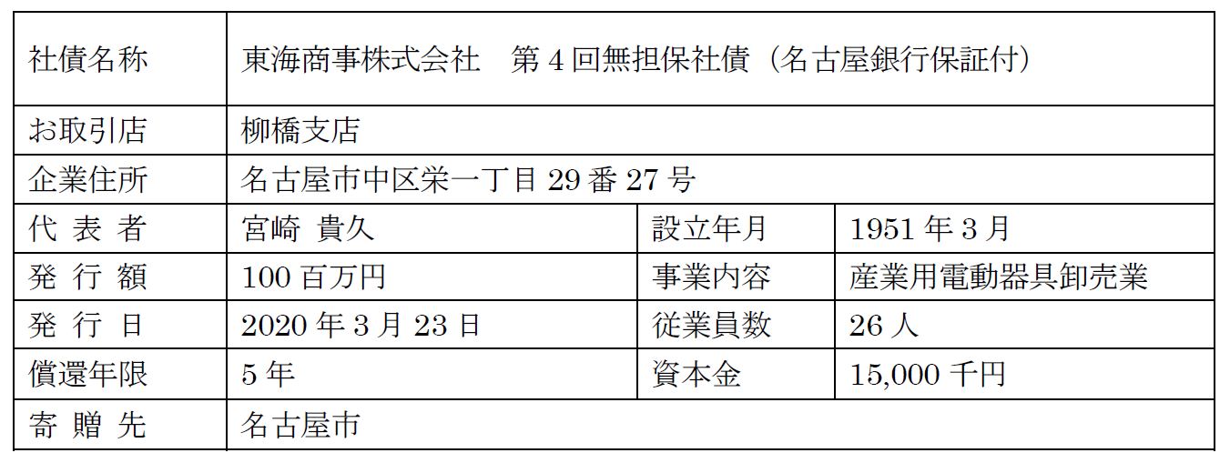 弊社は、2020年3月23日に第4回無担保社債(名古屋銀行保証付)SDGs・寄贈型私募債「未来への絆」1億円を発行いたしました。詳しくは下記名古屋銀行様サイトにてご確認ください。 » SDGs・寄贈型私募債「未来への絆」の取扱いについて(名古屋銀行様サイト)